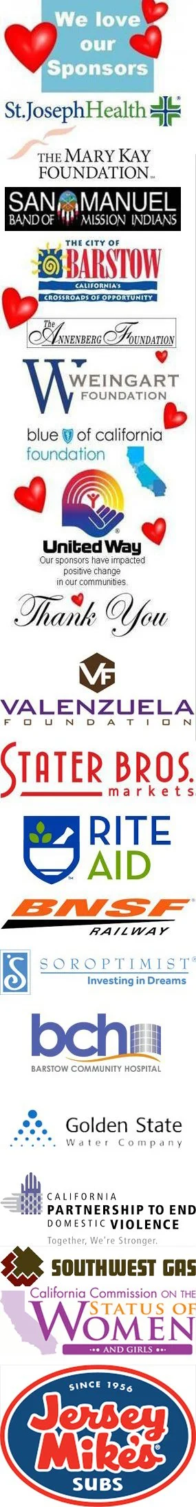 Our sponsors/community partners include Mojave Valley United Way who assists with funds for rent, utilities, food, fuel, motel, travel, small auto repair, financial planning and case management; San Bernardino County Sexual Assault Services provides weekly counseling at our office; Barstow Community Hospital Auxiliary; Family Service Agency of San Bernardino (providing counseling services), Evans-Harvey Resource Center (Behavioral Modification), CalWorks, Cal OES, Community Action Partnership, St. Joseph Health, Mary Kay, Annenberg Foundation; Blue Shield, Weingart Foundation, Valenzuela Foundation, San Manuel, ICLS Inland Counties Legal Services, and many more. All services are provided in the Barstow community.